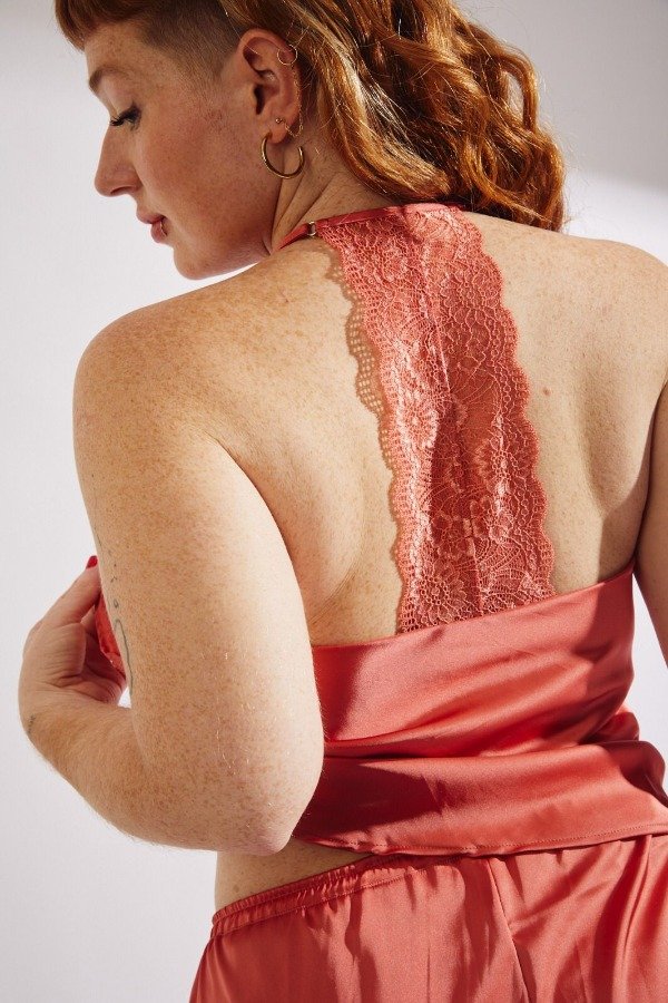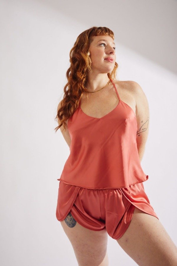 Pijama de satén con escote en espalda. Short con elástico para que se amolde a tu cuerpo.