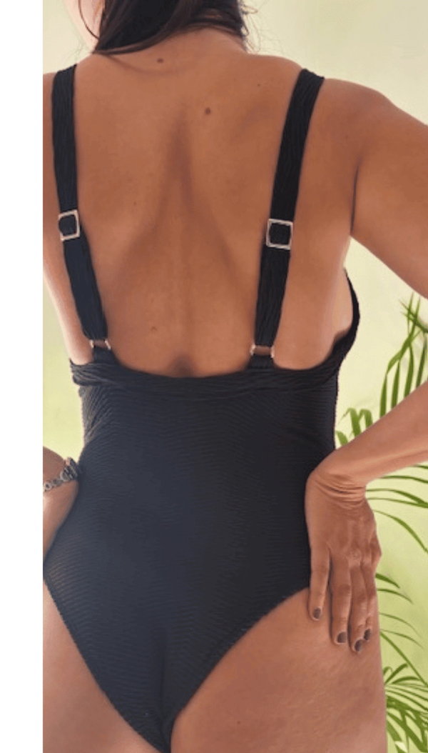 Enteriza que te puede armar un look divino para poolparty! Frente en V embolsado y pinza. Breteles a tono ajustables. Corte de bombacha tipo tanga. Espalda cruzada con reguladores y bien cavada. Forrada en frente y espalda. Confeccionada con lycra premium.